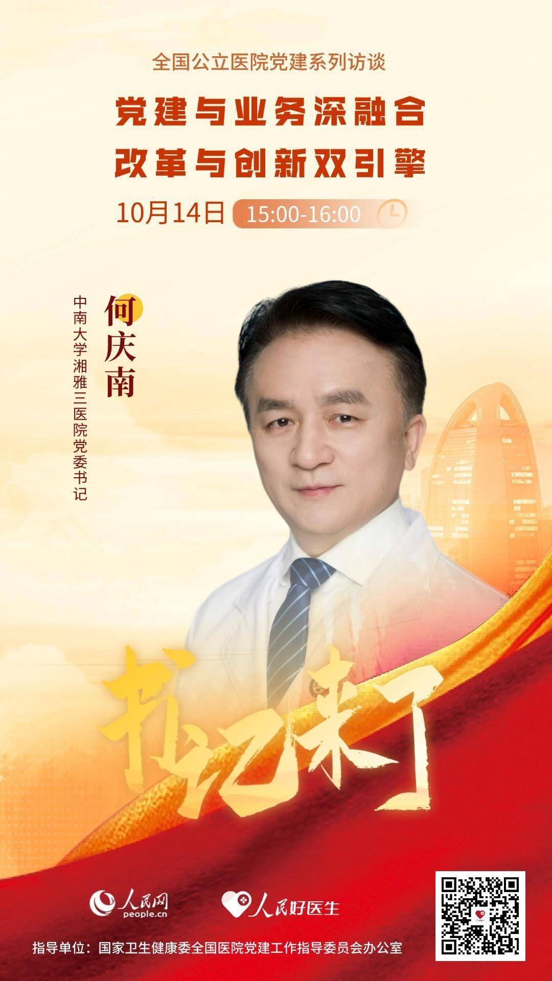 10月14日15:00-16:00,中南大学湘雅三医院党委书记何庆南将做客《书记来了》,与大家分享医院在加强党建、促进医院高质量发展等方面的经验和做法,敬请关注。